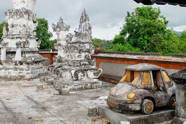 Paluang Temple Nusa Penida. It is also known as the car temple, because the shrine in this temple is in the form of a car. This temple which is located on the high seas has the difference that it has 13 pelinggihs and 2 of them have 2 pelinggihs in the form of VW Beatle and Jimmy cars. And this temple is the only one in the world that has a pelinggih in the form of a car and becomes its attraction.